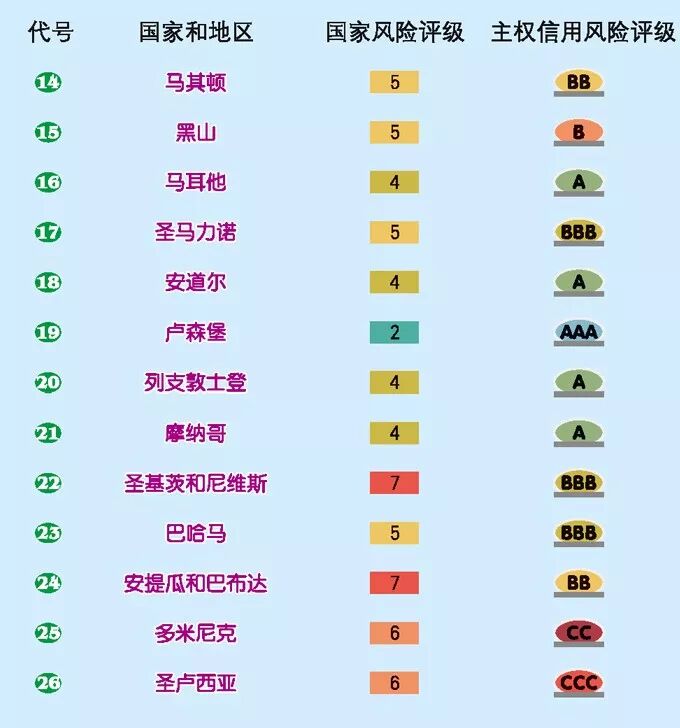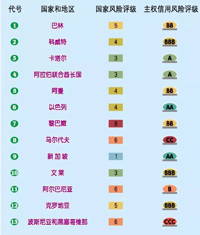 主权信用风险水平不变、评级保持稳定的国家有168个。调升了新加坡、阿尔巴尼亚、黑山、俄罗斯、萨尔瓦多、帕劳6个国家的评级,土耳其、也门、厄瓜多尔等7国被调降评级。从2018年国家风险和主权信用风险展望情况来看,国家风险展望为“正面”的国家有13个,“负面”13个,“稳定”的166个;主权信用风险评级展望为“正面”的国家有25个,“负面”23个,“稳定”的133个。