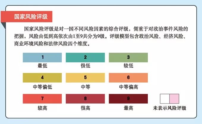 根据中国信保国家风险评级结果,2018年,国家风险水平变化不大、评级保持稳定的国家有178个。评级调升的国家7个,包括朝鲜、韩国、泰国、希腊、葡萄牙、哥伦比亚和吉布提,评级调升原因主要是部分地区地缘政治紧张局势有所缓解,部分国家政局稳定性增强,不确定性下降。评级调降的国家有约旦、卡塔尔、土耳其等7个,原因为部分海湾国家矛盾分歧扩大,国家风险管控效率可能降低等。