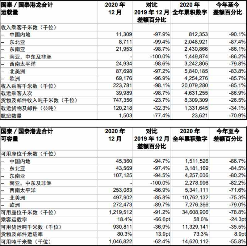 国泰航空在12月份载客三万九千九百八十九人次,较2019年同月下跌98.7%,收入乘客千米数按年减少98.1%。乘客运载率下跌66.6个百分点至18.4%,以可用座位千米数计算的运力则下跌 91.2 %。在2020年全年,国泰航空及国泰港龙航空的载客人次较去年下跌86.9%,运力收缩78.8%, 而收入乘客千米数则下跌85.1%。