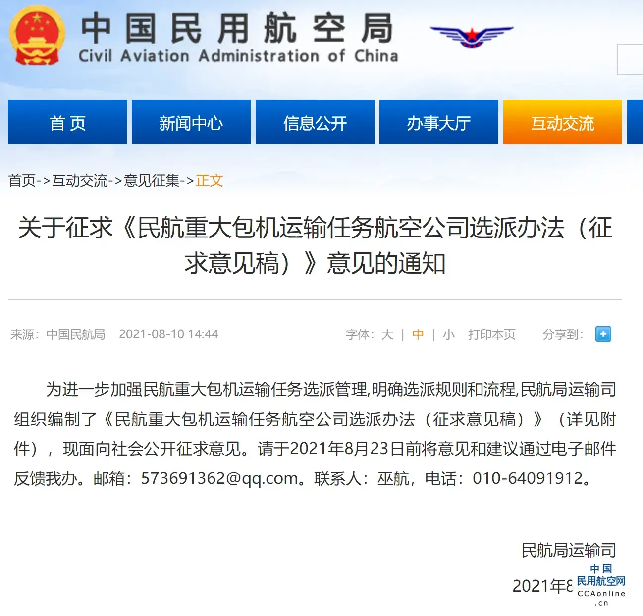 为进一步加强民航重大包机运输任务选派管理,明确选派规则和流程,民航局运输司组织编制了《民航重大包机运输任务航空公司选派办法(征求意见稿)》(详见附件),现面向社会公开征求意见。请于2021年8月23日前将意见和建议通过电子邮件反馈我办。邮箱:573691362@qq.com。联系人:巫航,电话:010-64091912。