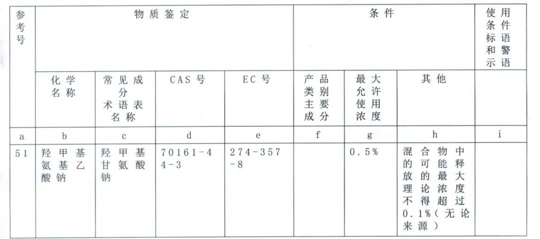 羟甲基甘氨酸钠已被欧盟G/TBT/N/EU/869号通报删除,并更新至化妆品法规附录V第51条款监管。更新后条目内容如下: