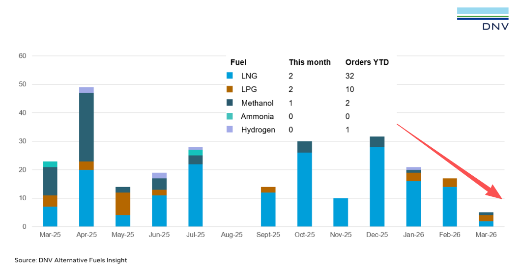 DNV数据显示,2026年第一季度,LNG燃料船订单达到32艘,在全部45艘替代燃料船订单中占据绝对多数;LPG燃料船以10艘位居其后。相比之下,甲醇燃料船虽然此前一度成为市场热点,但在今年一季度的新单表现已明显趋弱。