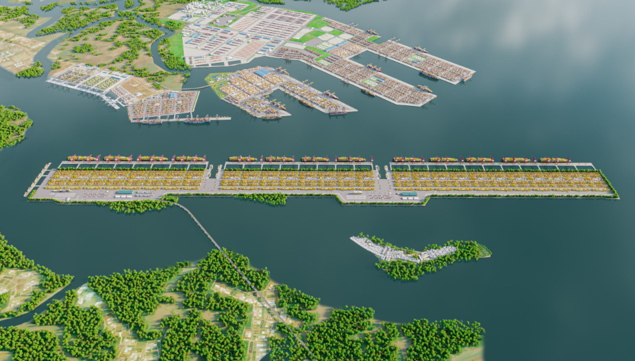 根据规划,该港口一期设计吞吐能力将在2030年前达到约480万TEU,并在2047年前逐步提升至约1690万TEU,远期规划仍预留进一步扩张空间。首期工程将建设最多4个泊位,可接靠最大24000TEU级超大型集装箱船;远期则计划扩展至13个泊位,总岸线长度约7.5公里。