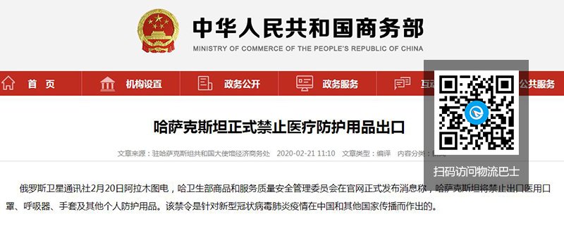 俄罗斯卫星通讯社2月20日阿拉木图电,哈卫生部商品和服务质量安全管理委员会在官网正式发布消息称,哈萨克斯坦将禁止出口医用口罩、呼吸器、手套及其他个人防护用品。