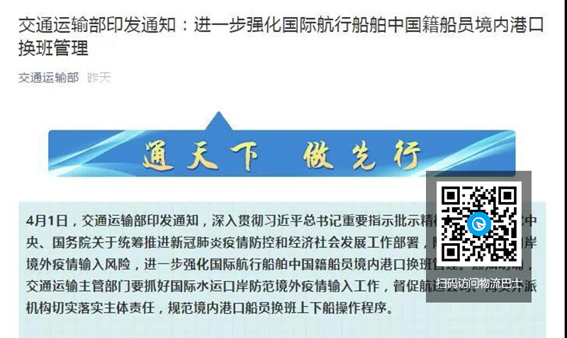 4月1日,交通运输部印发通知,防范国际水运口岸境外疫情输入风险,进一步强化国际航行船舶中国籍船员境内港口换班管理。