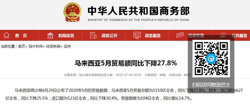 马来西亚统计局6月29日公布了2020年5月的贸易数据,马来西亚5月贸易总额为1150亿令吉,同比下降27.8%。其中,出口额为627亿令吉,同比下降25.5%;进口额为523亿令吉,同比下降30.4%。贸易顺差为104亿令吉,同比增长14.7%。