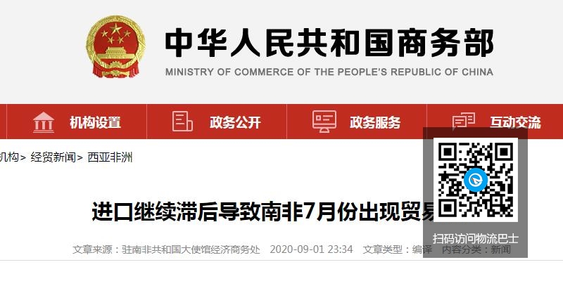 据南非新闻24小时9月1日报道,南非税务局(SARS)最新公布的贸易数据显示,由于全球需求改善导致出口增加,南非7月份录得374.2亿兰特的贸易顺差。