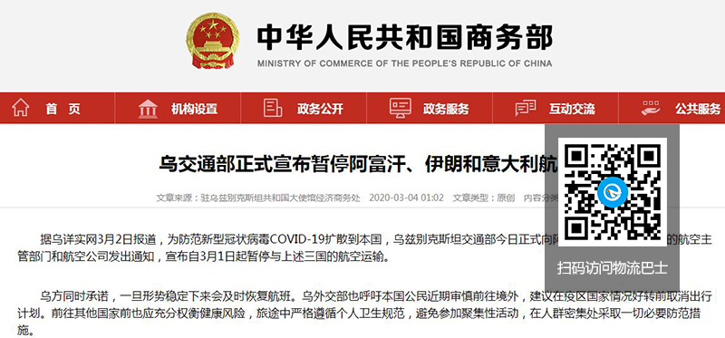 乌兹别克斯坦交通部宣布本月起暂停以下3个国家的航空运输